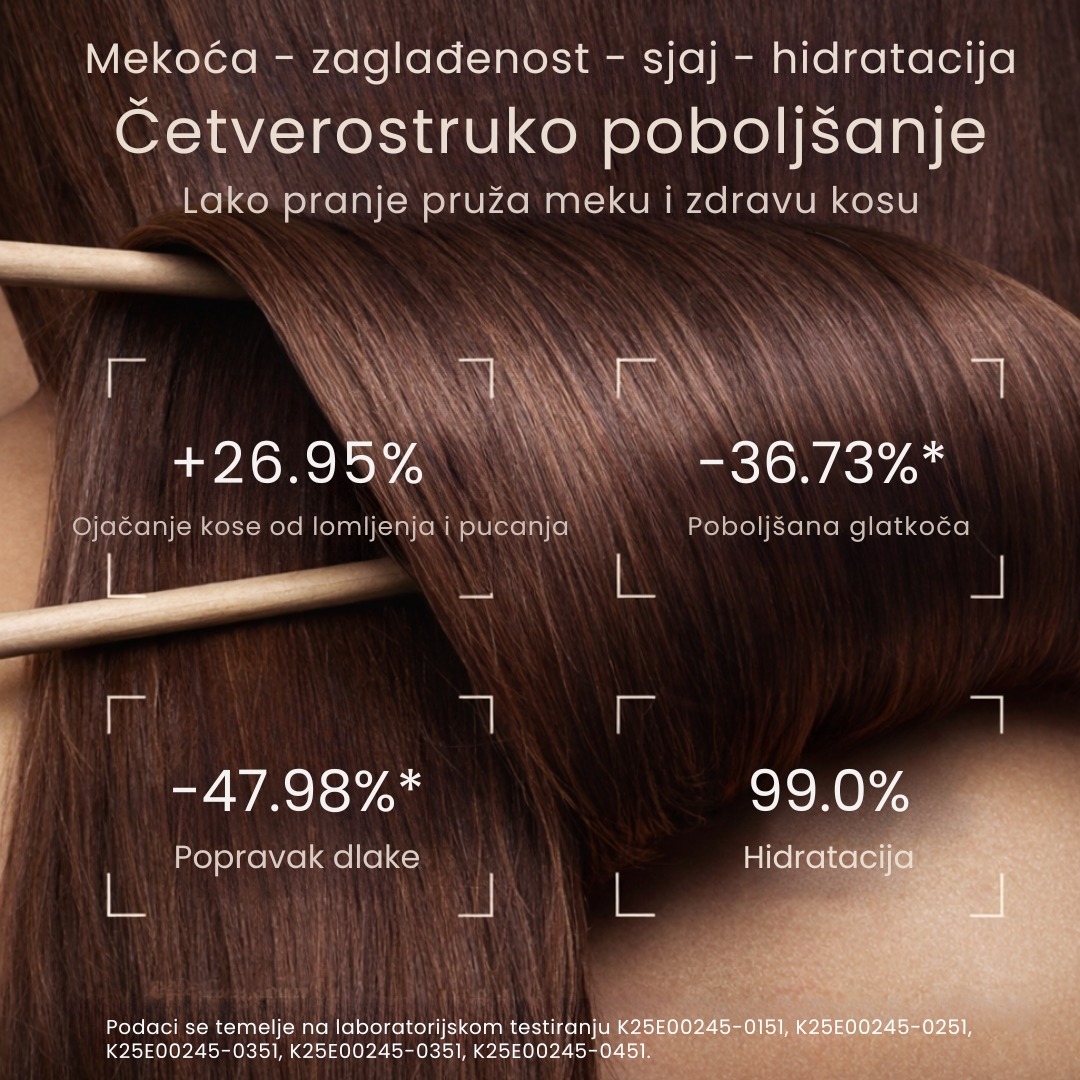 Kolagen prodire u vlas i popunjava oštećene dijelove, dok proteinski sastojci jačaju strukturu i štite od daljnjeg lomljenja. Površina kose postaje zaglađena — lakše se češlja, zdravije izgleda.